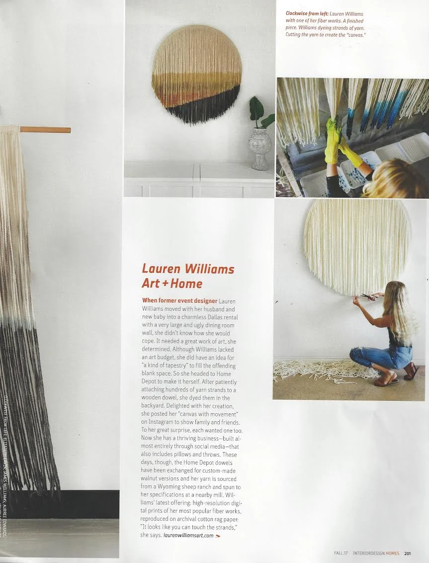 When former event designer Lauren Williams moved with her husband and new baby into a charmless Dallas rental with a very large and ugly dining room wall, she didn't know how she would cope. It needed a great work of art, she determined. Although Williams lacked an art budget, she did have an idea for "a kind of tapestry" to fill the offending blank space. So she headed to Home Depot to make it herself. After patiently attaching hundreds of yarn strands to a wooden dowel, she dyed them in the backyard. Delighted with her creation, she posted her "canvas with movement" on Instagram to show family and friends.