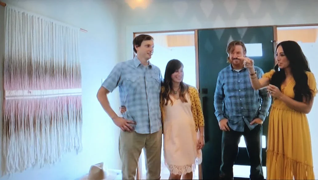 At the end of the show, during the reveal, Chip and Joanna stood in the entryway with her sister and brother-in-law right next to my tapestry and the art got some quality air time.