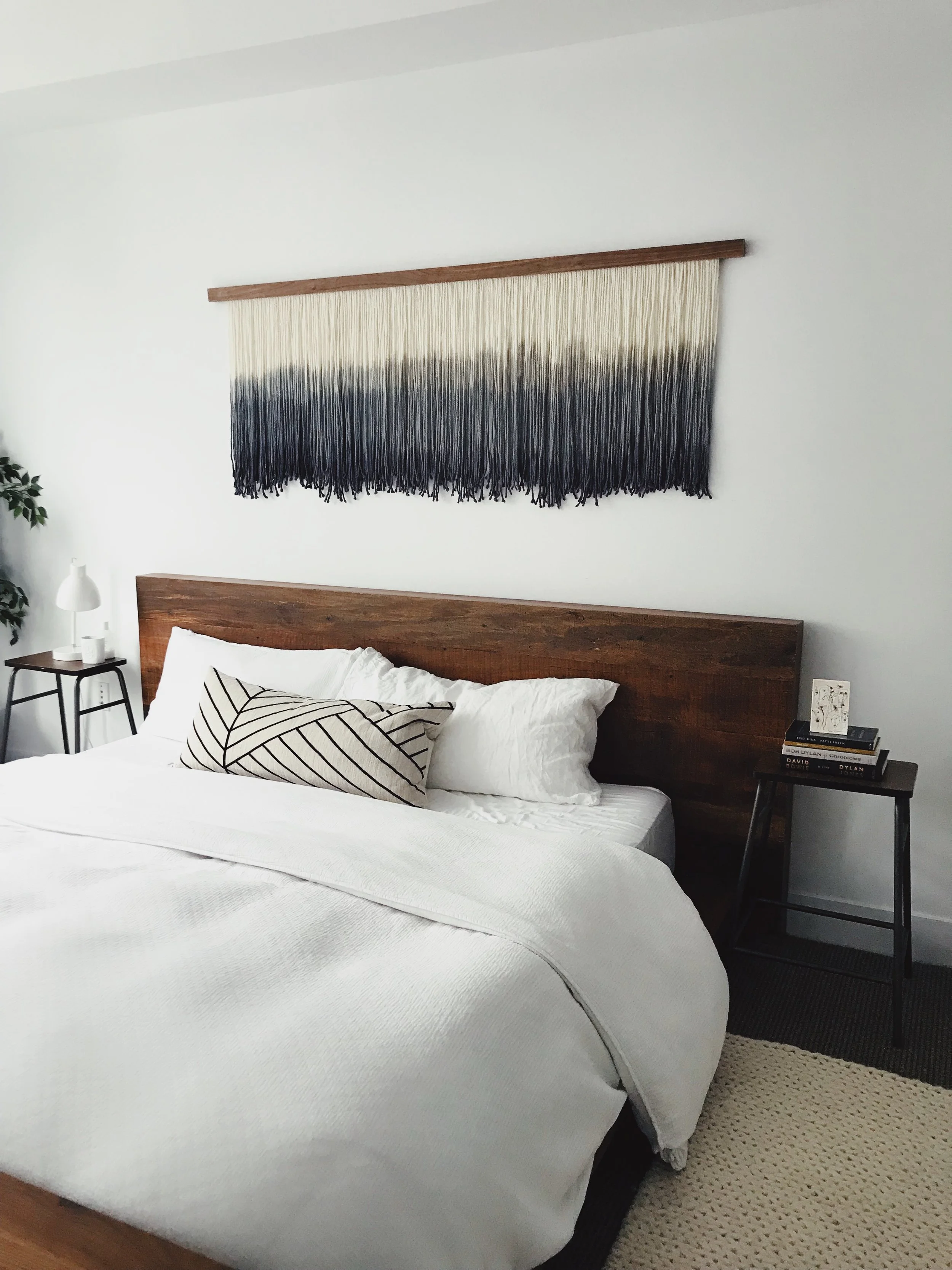 The piece sits above my bed frame perfectly. The wooden base also matches the frame of my platform bed perfectly. Also, I live in California- and was always told not to have a framed picture above your bed in case of earthquakes! Lauren's piece allowed me to have something beautiful and functional - aka won't knock me out in my sleep if it falls in the middle of the night unexpectedly! :)