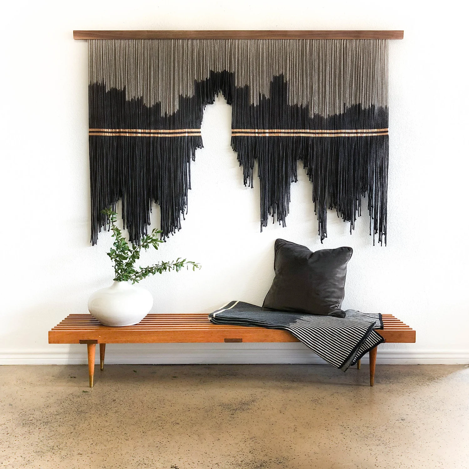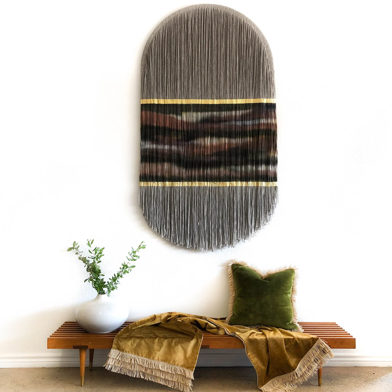 Each month I release new Canvas With Movement® artwork and this month is an exciting collection of pieces that I cannot wait for you to view! I have developed a new design of tapestries called the “Long Circle” built with my signature Canvas With Movement® yarn in a gray color palette. A blend of wool from both black and white sheep, the gray strands are not dyed, but carefully spun in a perfected proportion, resulting in naturally created gray fibers. The gray strands are suspended from a circular frame in a “perfectly imperfect” form of round fiber art.