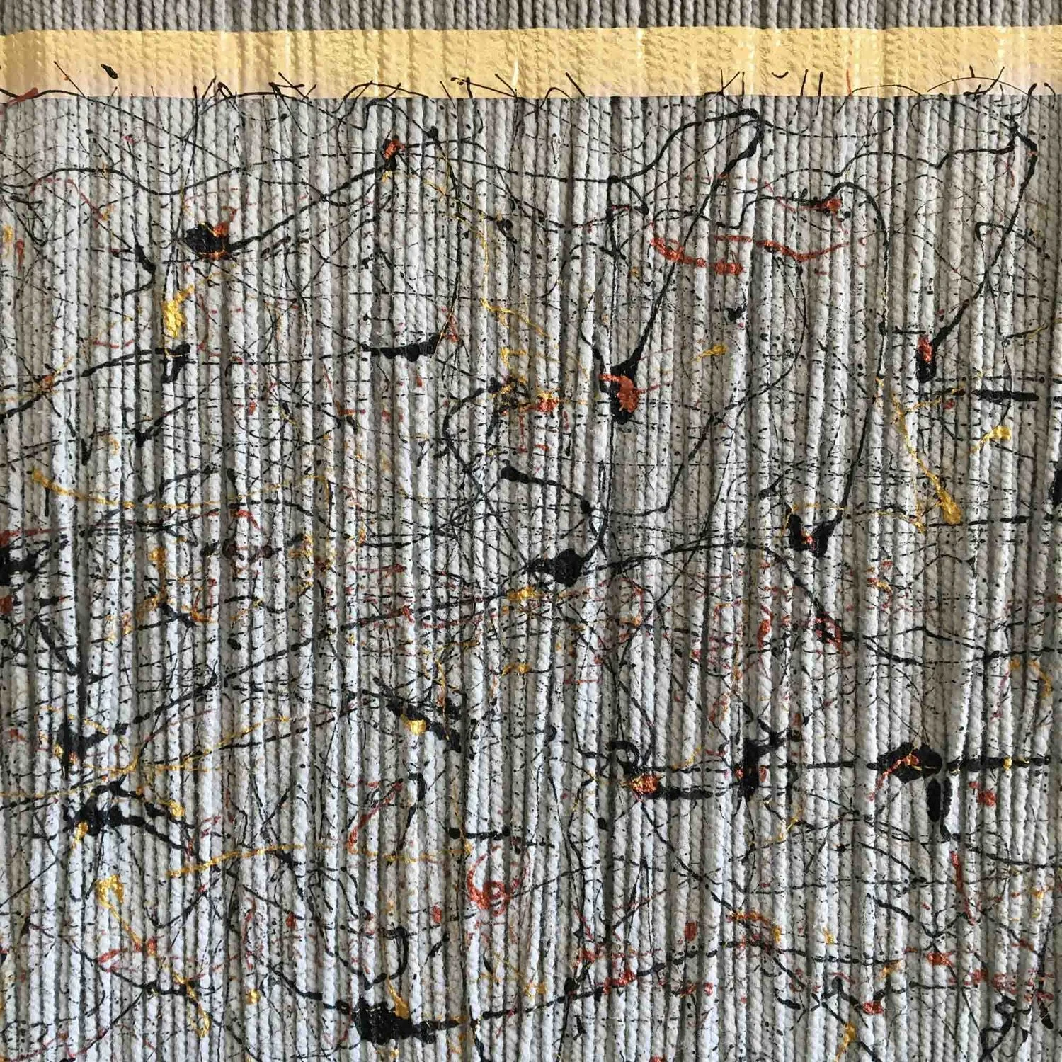 You will see in the Long Circle pieces my approach to painting a Canvas With Movement® tapestry. The first Long Circle design expresses my passion for movement and motion in my artwork. Although the painted strands are held in place by two metallic lines, I wanted to convey movement through the painted layers in the design. I incorporated a Jackson Pollock style on the last two of the pieces, which felt very appropriate as Pollock’s works, which came to be known as “drip paintings,” present less a picture than a record of the fluid properties of paint itself.