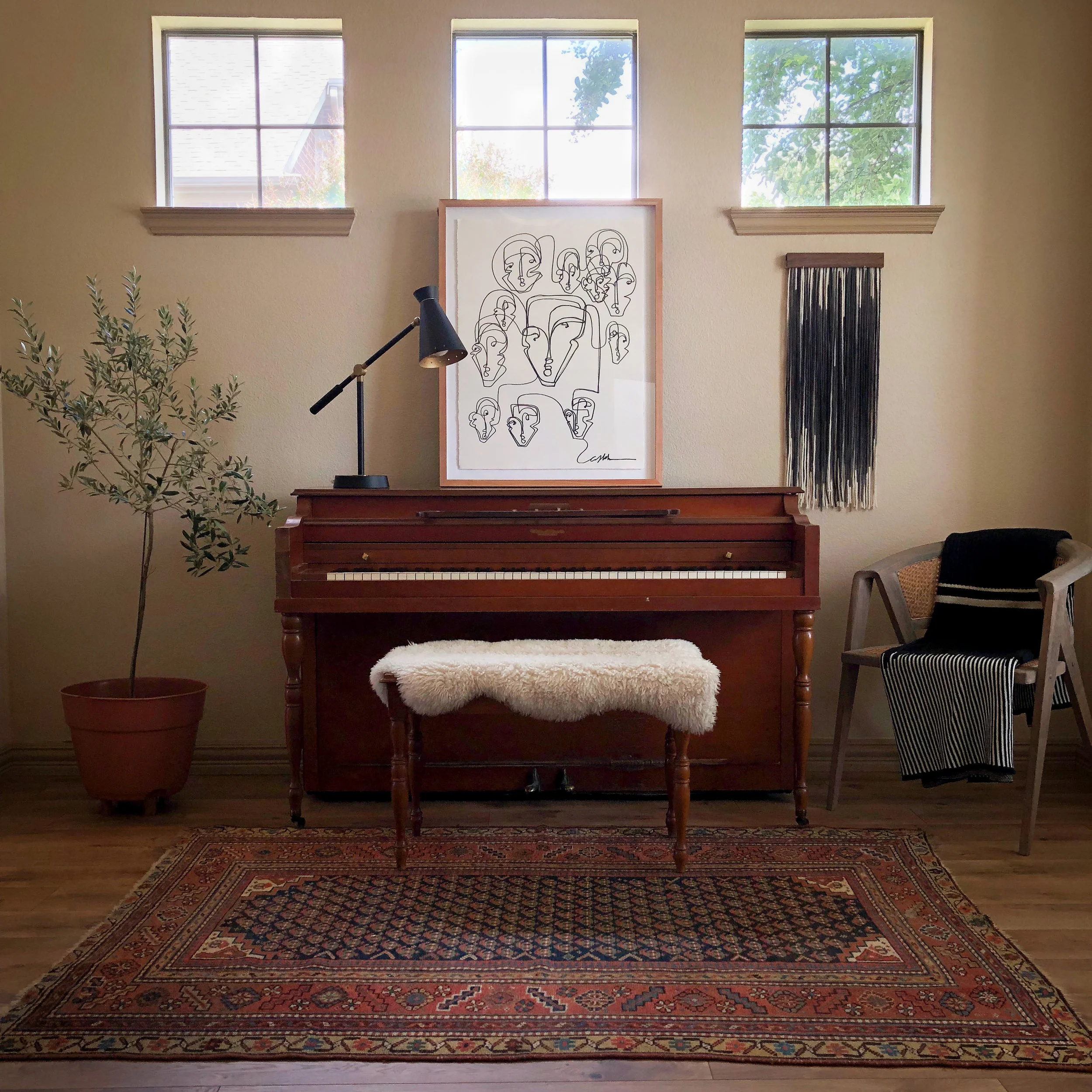 Mini Tapestry paired with framed art by Carly Kuhn of @thecartorialist in Lauren’s family piano room. Vintage upright piano and bench found on Craigslist. Vintage rug from Jean Palmer Home. Chair with Lauren Williams + Ditto House tapestry-inspired cotton knit throw available online: https://www.laurenwilliamsart.com/store