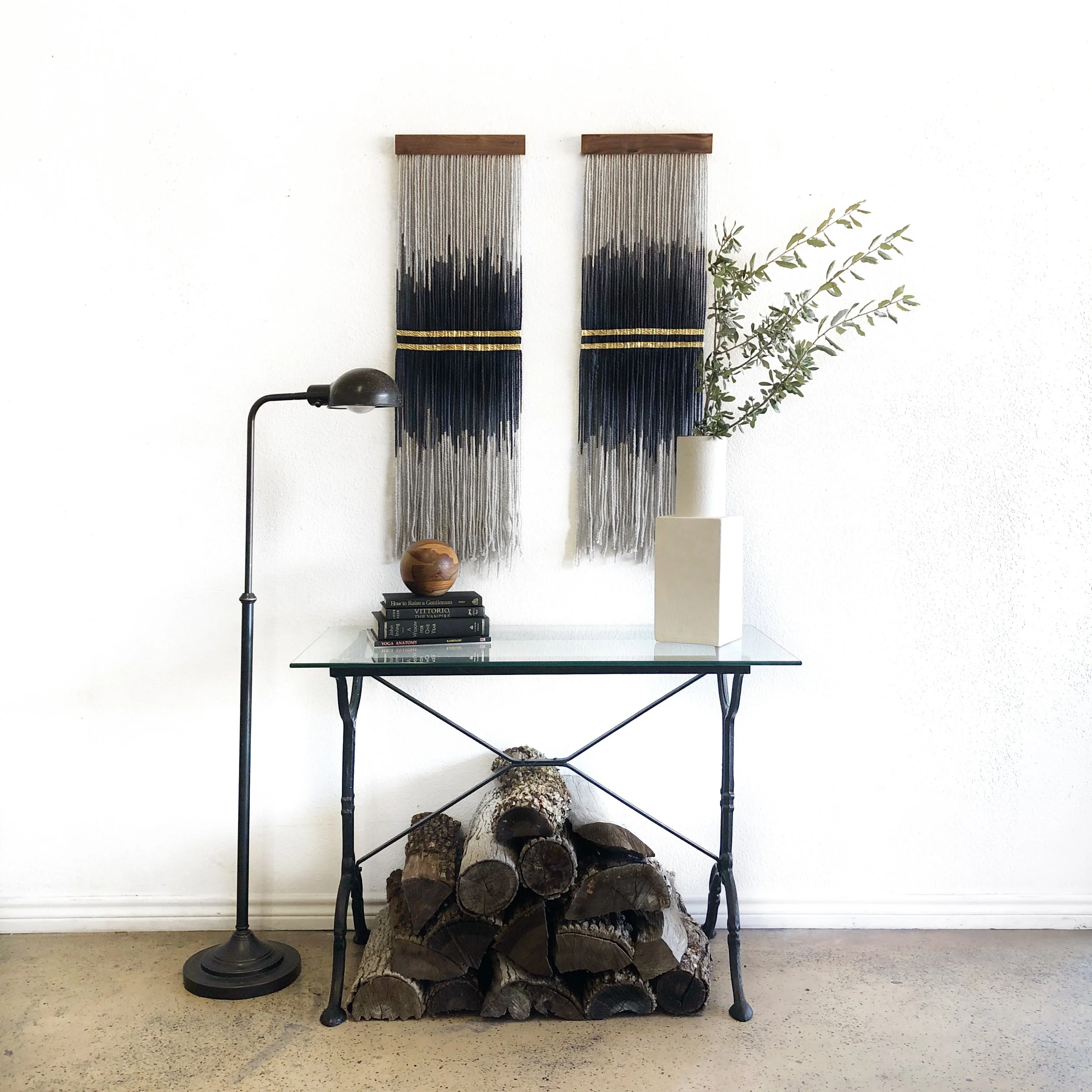 With just as much detail and depth as Lauren’s large scale artwork, the Mini Tapestries have been a project in the making for a long time. Each Mini measures 12” wide and varies in height. Lauren’s signature wool strands are suspended from a stunning piece of walnut wood and come with the hanging hardware for an easy installation. Metallic detail has been meticulously added to select pieces and some designs were created to be perfectly paired, while others are ready to stand alone.
