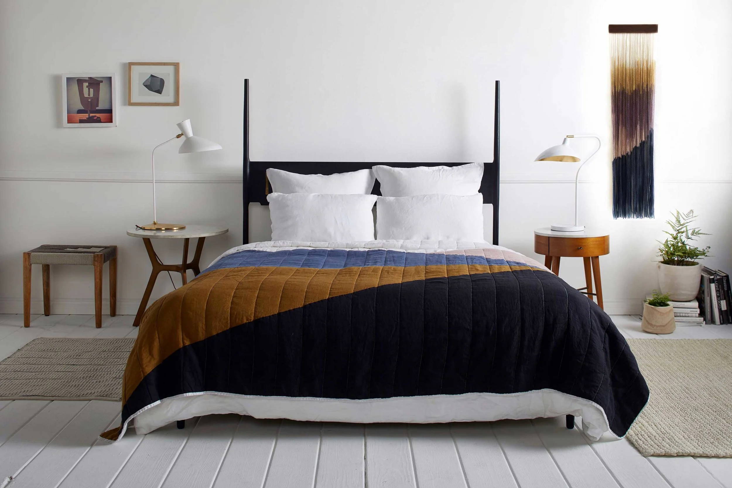 A pair of “Revolution” Mini Tapestries positioned over vintage nightstands by Kent Coffey from @theceh. Painting by Lauren Williams, above modern platform bed by West Elm. Tapestry-inspired bedding by Parachute + Lauren Williams, available online: https://www.laurenwilliamsart.com/store