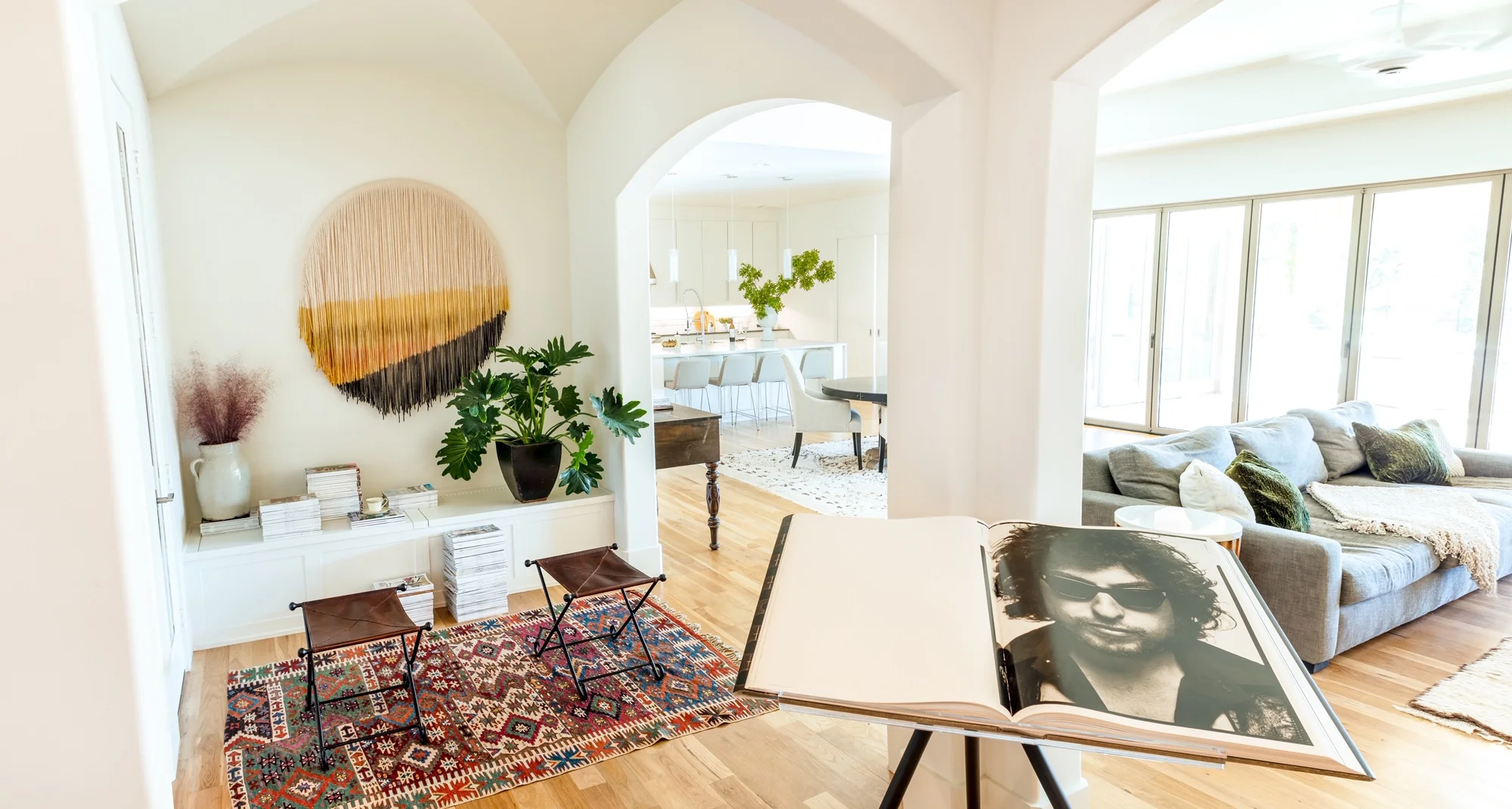 Even though I’ve hung hundreds of tapestries on my own wall, there was a little pressure to hang my art on a brand new wall in a brand new home (while my client is watching!). But when I arrived, tool box and art in hand, Sherry welcomed me with the warmest smile and hug, and a tour of her gorgeous, single story, modern home. The decor was clean, with a balanced mix of vintage and modern touches and the feeling of artistic appreciation beginning with a baby grand piano in the foyer, the Annie Leibovitz SUMO book on it’s own tripod bookstand, a wall sized vintage map of Paris hanging opposite a glass, and a temperature controlled wine room. Remember, I’m still just in the entryway!