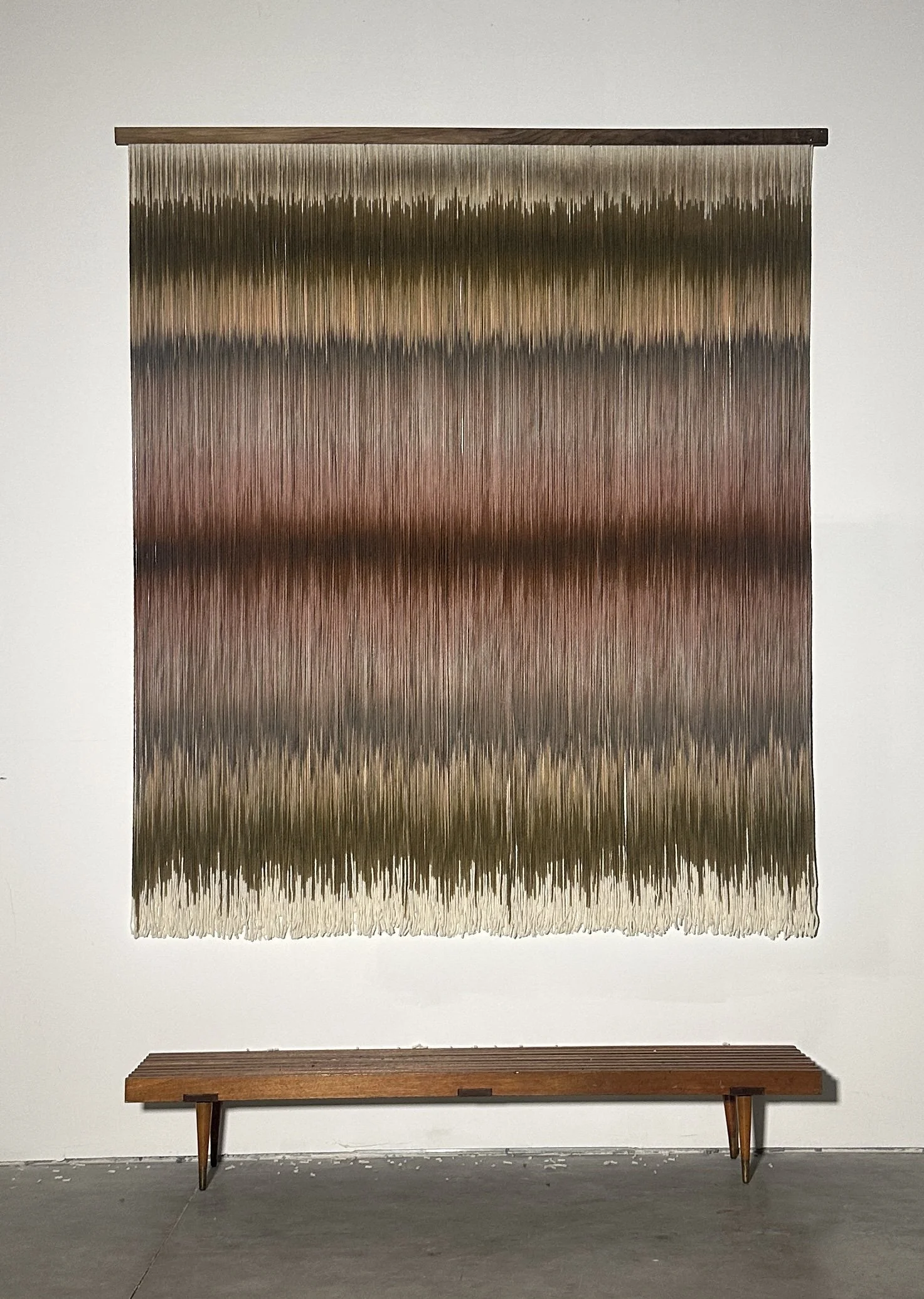 “Bohemian Rhapsody” 2025 using Lauren’s signature Canvas with Movement wool, walnut, dye and paint